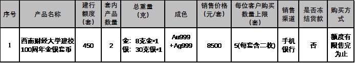 根据中国人民银行贵金属纪念币发行安排,“西南财经大学建校100周年金银纪念币”已于近日公告发行,我行根据安排将参与本产品的销售工作。现将有关事项公告如下: