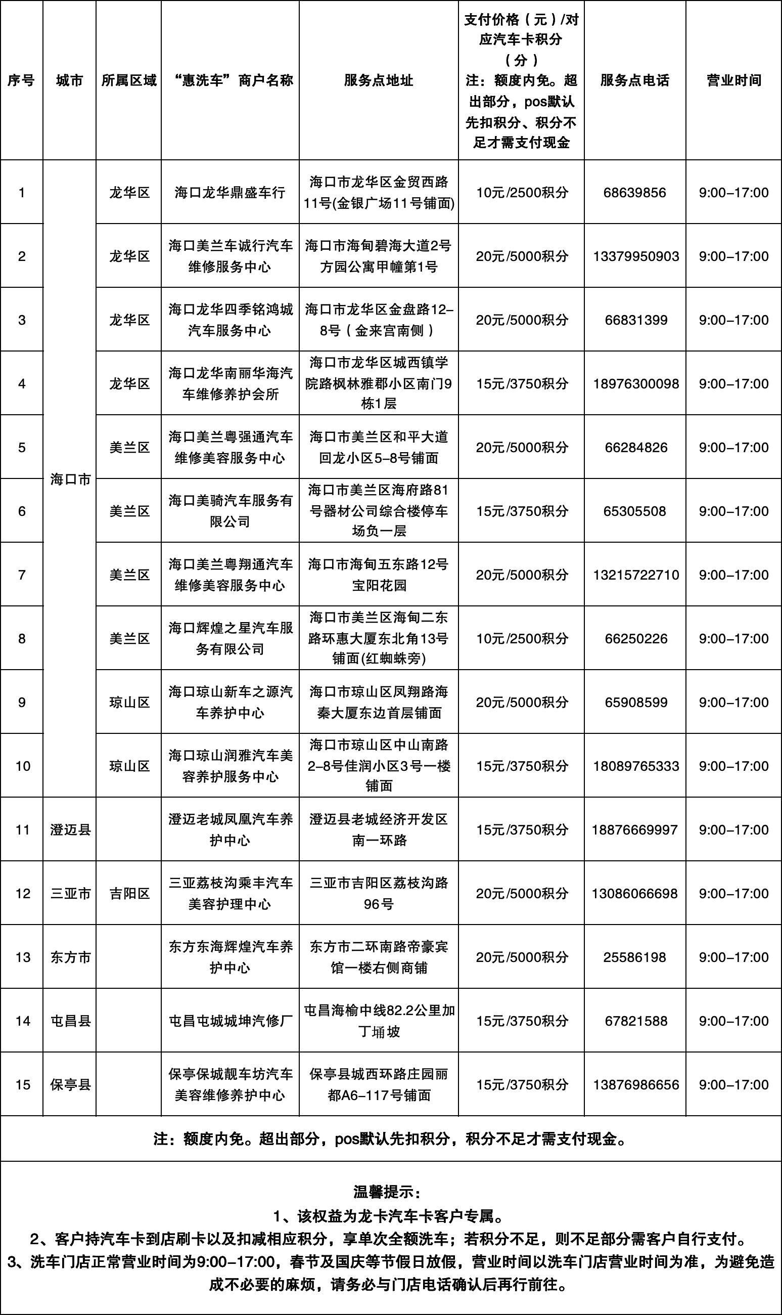 海南分行“惠洗车”商户服务网点信息表(信息更新时间:2025年11月20日)