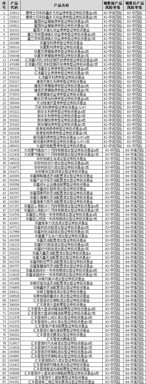 根据《证券期货投资者适当性管理办法》(证监会令第130号)、《基金募集机构投资者适当性管理实施指引(试行)》(中基协发〔2017〕4号)、《商业银行代理销售业务管理办法》(金规〔2025〕6号)等规定要求,为切实履行适当性义务,保护投资者权益,我行遵循公募基金产品风险等级评定孰高原则,并持续开展产品风险等级动态评估工作。近期已调整部分代销公募基金产品风险等级。调整后客户风险承受能力评估等级可能存在与产品风险等级不匹配情况,请您及时关注。