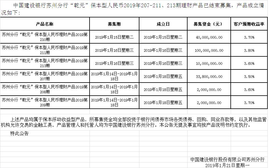中国建设银行苏州分行“乾元”保本型人民币2019年207-211、213期理财产品成立公告
