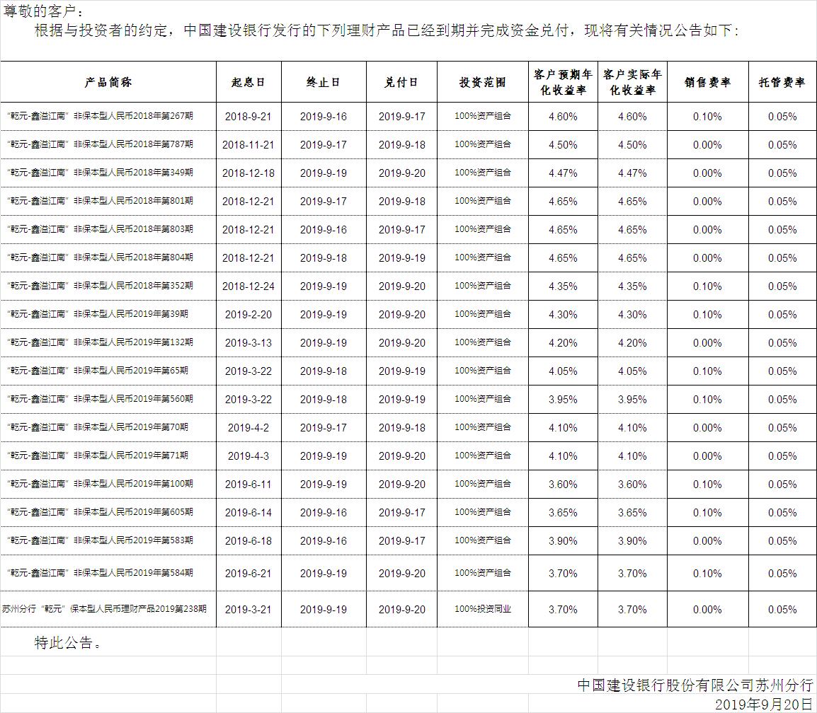 中国建设银行理财产品终止及清算公告