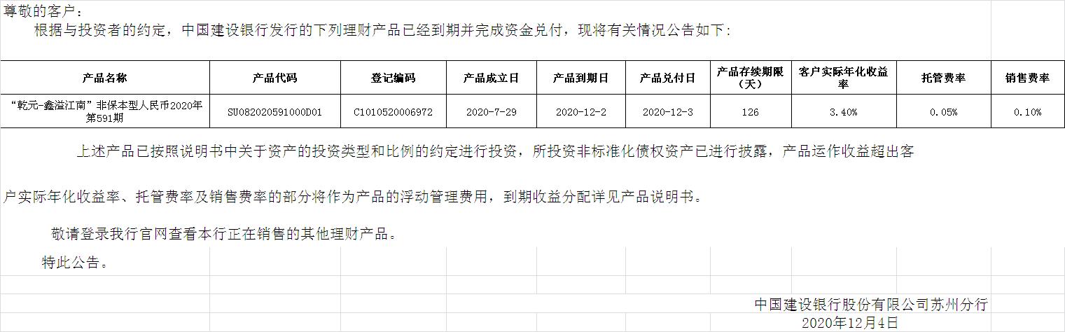 中国建设银行理财产品终止及清算公告