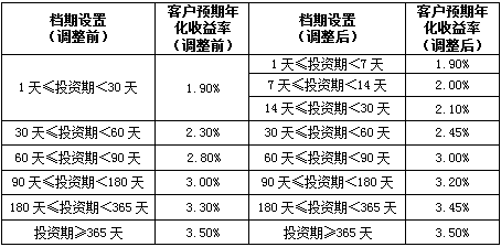 新客户预期年化收益率于2017年1月24日(含)起执行。对于2017年1月24日(不含)前已经购买成功且未赎回的所有存量客户投资本金,按照客户实际持有天数,其中2017年1月24日(不含)前持有部分执行原客户预期年化收益率,2017年1月24日(含)后持有部分自动执行新客户预期年化收益率,但以最终支付的实际年化收益率为准。