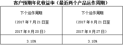 中国建设银行对本产品(产品编号:BJ072013007737D01)下个运作周期的客户预期年化收益率不作调整,详见下表: