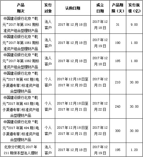 中国建设银行北京市分行定于2017年12月18日发行理财产品,现将相关发行情况公告如下: