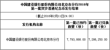 中国建设银行股份有限公司北京市分行2018年第一批贺岁普通纪念币发行结果
