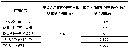 高资产净值客户新预期年化收益率及其他产品要素调整于2018年1月24日(含)起执行。对于2018年1月24日(不含)前已经购买成功且未赎回的所有存量高资产净值客户投资本金,按照实际持有天数,其中2018年1月24日(不含)前持有部分执行原客户预期年化收益率,2018年1月24日(含)后持有部分自动执行新高资产净值客户预期年化收益率,但以最终支付的实际年化收益率为准。