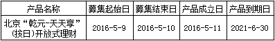 “乾元-天天享”(按日开放型)人民币非保本理财产品于2016年5月11日正式成立。截至报告日,本产品规模为18,819,651,753.79元。