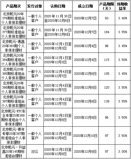中国建设银行北京市分行定于2020年11月30日至2020年12月4日发行理财产品,现将相关发行情况公告如下: