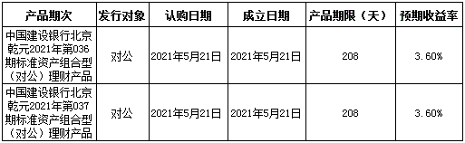 中国建设银行北京市分行定于2021年5月17日至2021年5月21日发行理财产品,现将相关发行情况公告如下: