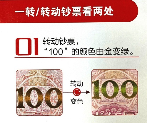 1.转动钞票观察,票面正面中部面额数字会变色。“50”“10”由绿变蓝,“100”“20”“5”由金变绿。
