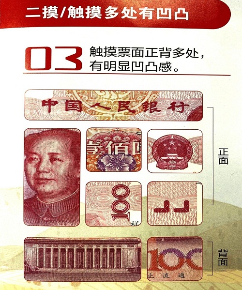 用手指触摸票面正面的毛泽东头像、国徽、“中国人民银行”行名、右上角面额数字、盲文及背面主景图案等处,有明显的凹凸感,其中5元的左下角面额数字5和对印图案增加了凹凸感。