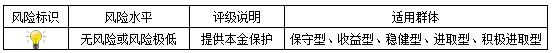 本期产品为保本浮动收益型理财产品,本理财产品有投资风险,只保障理财资金本金,不保证理财收益,您应当充分认识投资风险,谨慎投资。本期产品期限为65天(中国建设银行有权对产品进行展期或提前终止)。本期产品内部风险评级级别为一盏警示灯,风险程度属于无风险或风险极低,适用于保守型、收益型、稳健型、进取型及积极进取型投资者。最不利情况下,客户只能收回投资本金,不能获得任何投资收益。