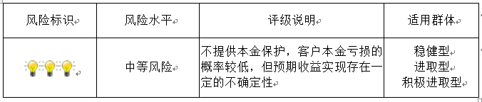 本期产品为非保本浮动收益型理财产品,不保证本金和收益,请您充分认识投资风险,谨慎投资。本期产品期限189天(中国建设银行有权对本期产品进行展期和提前终止),存续期内产品不接受申购或赎回申请。本期产品内部风险评级级别为3盏警示灯 ,风险程度属于较低风险。最不利情况下,资产组合无法回收任何本金和净收益,客户将损失全部本金。产品适合于收益型、稳健型、进取型、积极进取型客户。